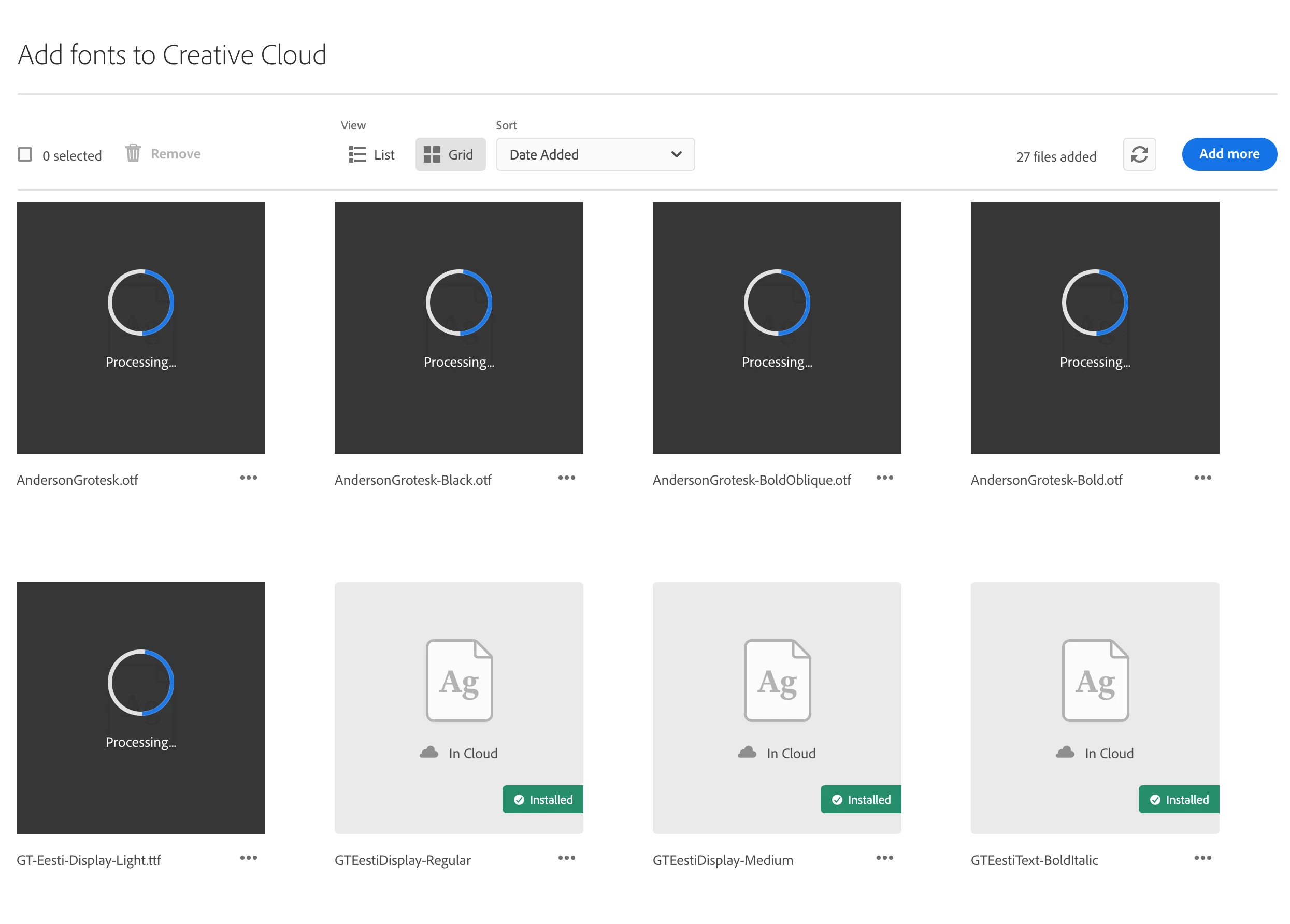 Last week the Add fonts to Creative Cloud bug was fixed and this feature seemed like it had been resolved. I've added a few fonts in today and it was working fine. Then I added another font and it is stuck on Processing. I removed it, added a previous font that had worked as of a couple days ago and that font and others I've added in are all stuck on Processing now too. I also restarted in-between doing this testing. See image attached for how things currently look.