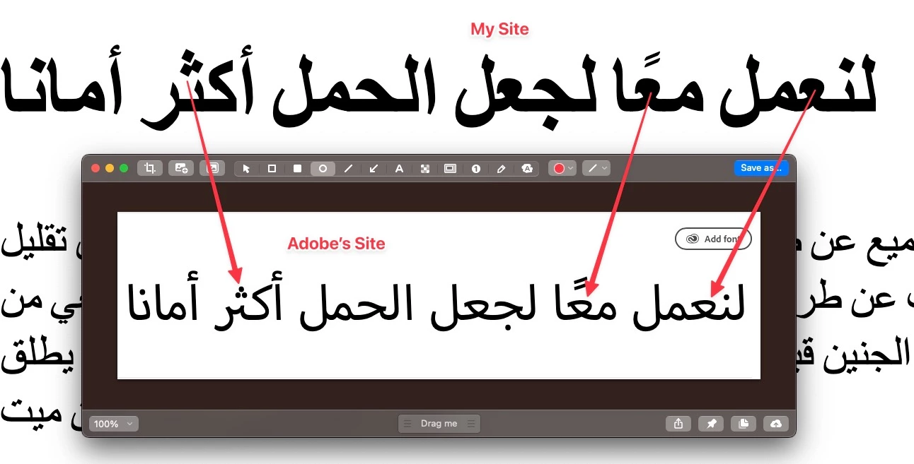 Just for reference, this is what it displays in Adobbe's site (https://fonts.adobe.com/fonts/myriad-arabic) versus my site (pointed a few discrepancies), but the text looks just not right: