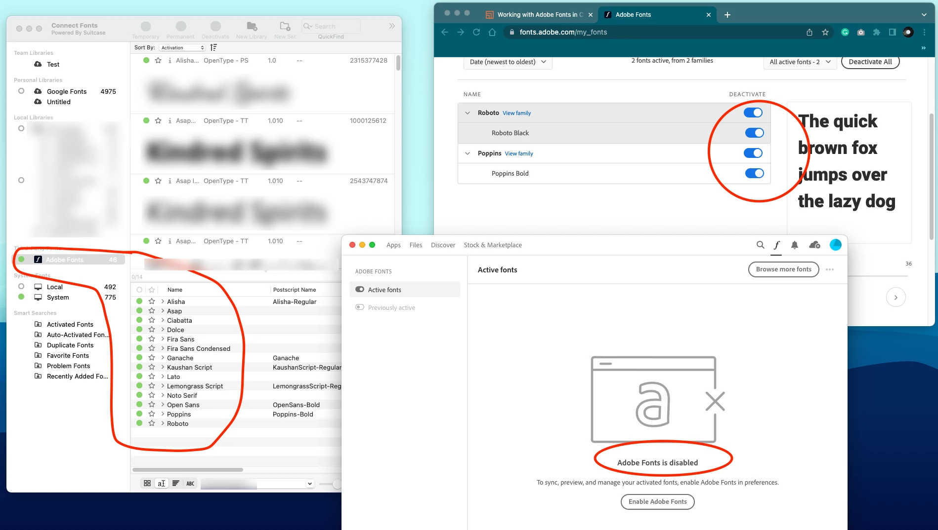 When our Macs are started up or rebooted, Adobe fonts will auto-activate several fonts (some appear as activated in the "Manage Fonts" dashboard online and others will appear as activated in Suitcase/Connect) even though the Adobe Fonts toggle is disabled in CC app, and all of our Adobe apps have auto-activation disabled. None of these fonts should be activated. This happens before any Indesign/Illustrator/Photoshop files are even opened. This happens on every Mac on our team. With Adobe Fonts disbaled within every app, and in the CC app, why are they still forcing themselves to activate? We primarily use Google Fonts, and Adobe Fonts forcing activations of their versions of the same fonts only cause issues in our workflow. Is there a way to COMPLETELY disable Adobe Fonts?
