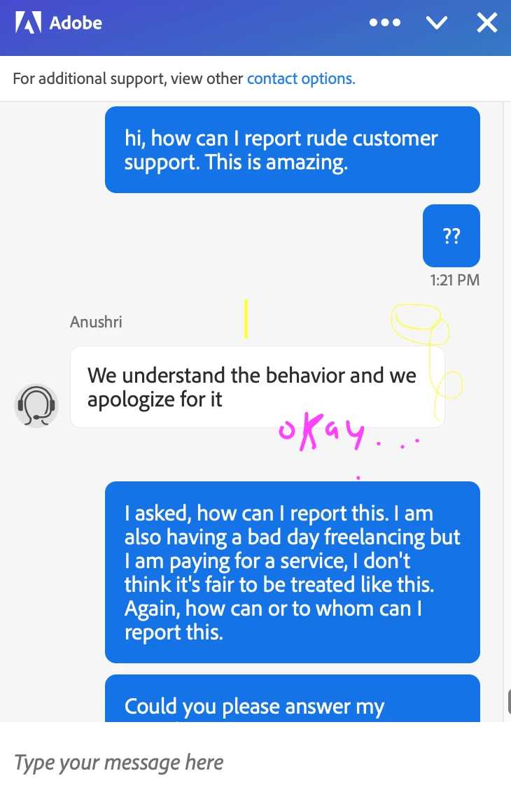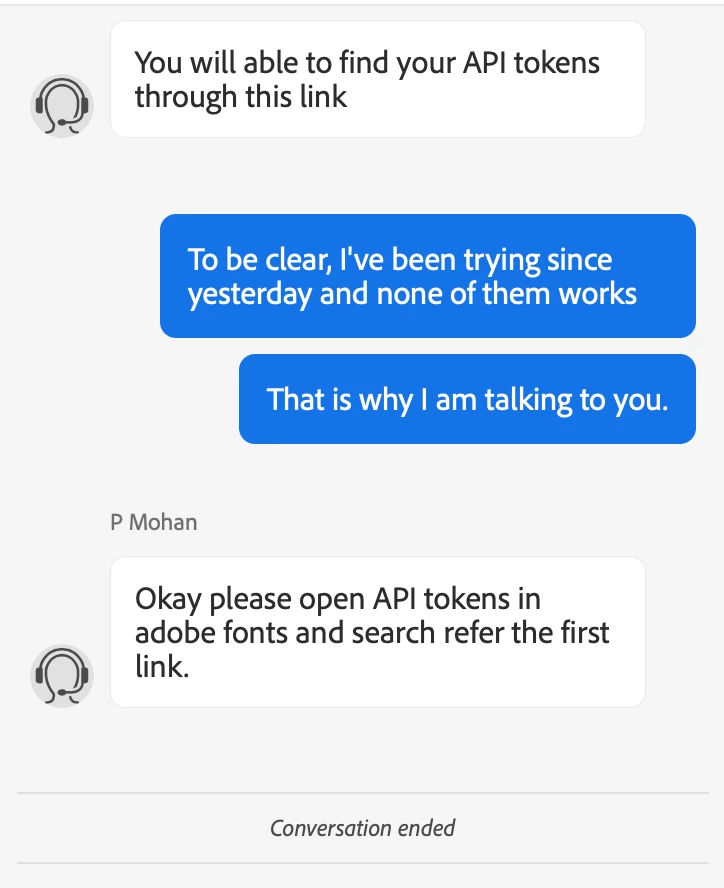 They kept on switching me from one agent to the other, the second agent kept on sending me dead links and even urls with several Typos (He didn't even knew the right Adobe Fonts URL) and finally he ended the conversation telling me to go check on the APIs website.
