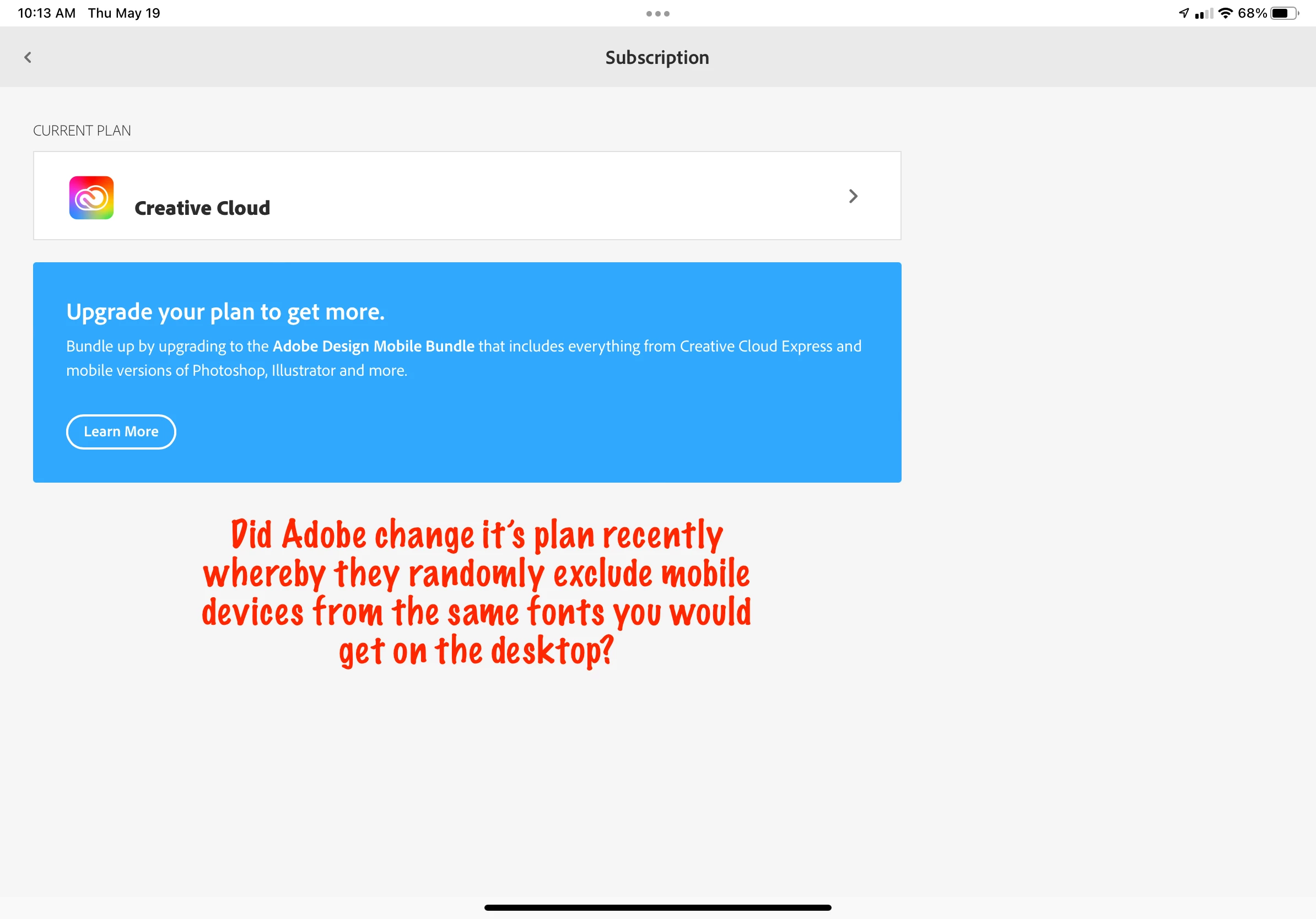 Adobe Fonts available on Windows/MacOS, but "not in your plan" for iPad-even though it used to work