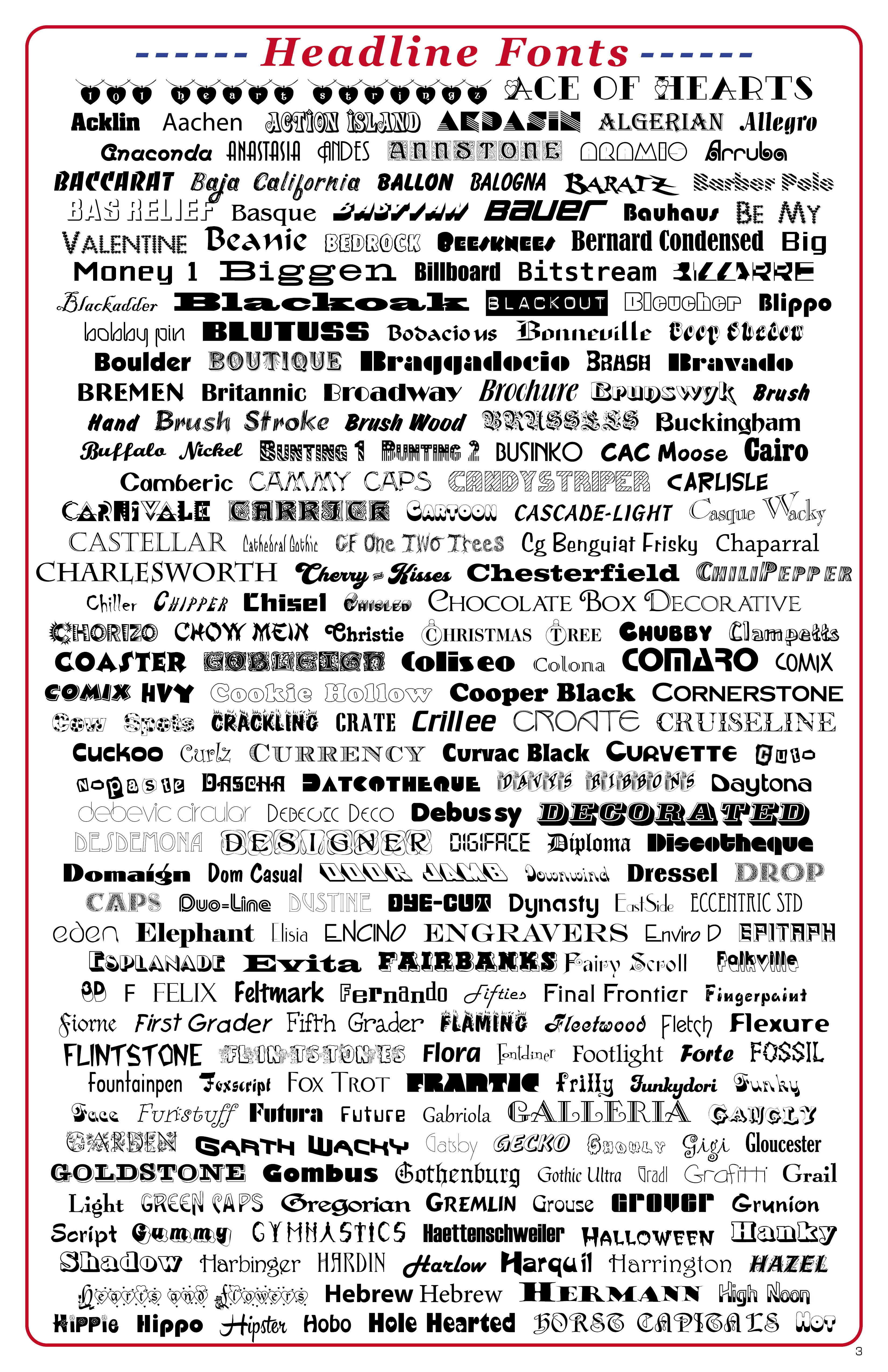 According to Adobe it has about 3600 font families. As I work on projects, western, modern, fun, etc... I need to quickly browse typestyles to select. A catalog like below wokuld be a huge help. Adobe - please help.