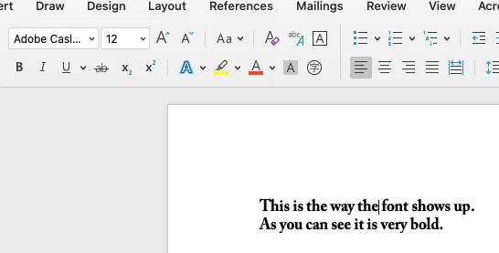 When I attempt to use Adobe fonts (for example Caslon or Garamond) in Microsoft Word for Mac 16.40 (20081000) they appear as quite heavy bold even when I have roman selected. See the attached screenshot: