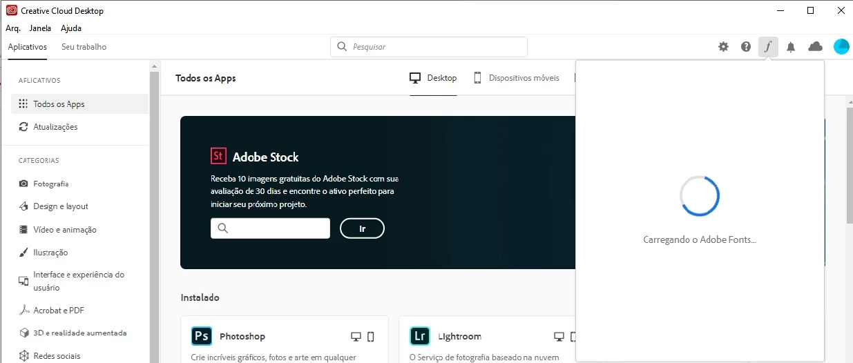 The Adobe Fonts icon just shows a never ending spinning progress wheel: