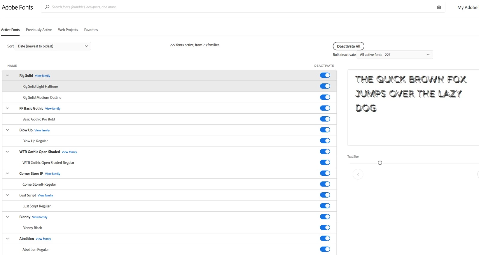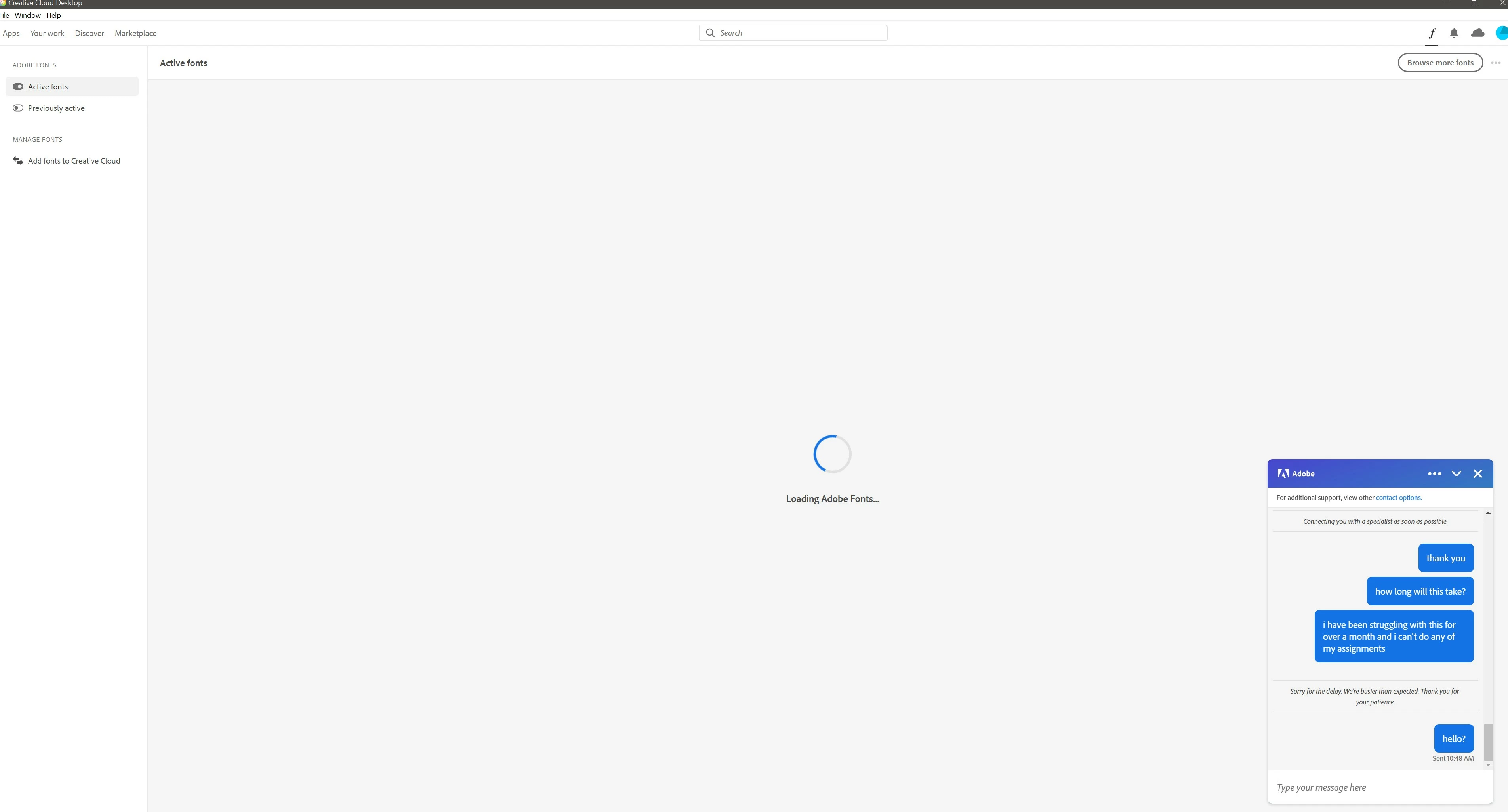 Everything is activated in Adobe Fonts. All of the preferences are activated on Creative Cloud Desktop. But NONE of my 277 activated fonts will show in any app anywhere. I can't get any work done at all. I am just wasting hours and hours of time uninstalling, reinstalling, updating, activating, deactivating, sitting on hold waiting and waiting for the chat to respond. NOTHING works. It's ridiculous.