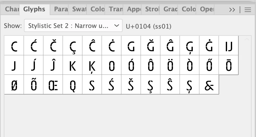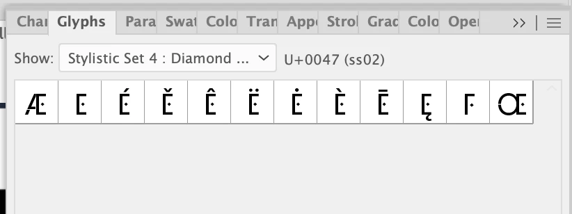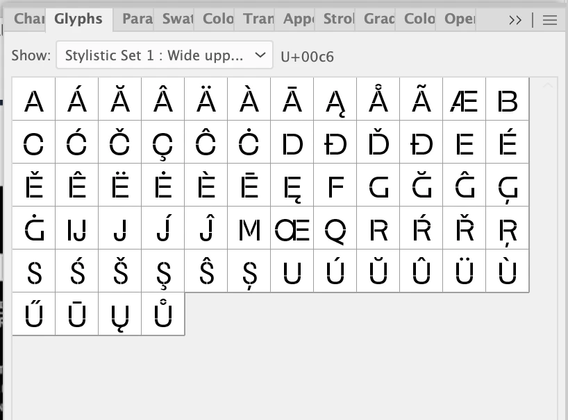 In the Adobe Fonts, I activated the Neighbor Stencil family. In the description, it shows some really neat examples of wide upper case, narrow uppercase, diamond upper case, and many other alternate options. Had the designer not uploaded these samples, I would never have realized I'm not seeing all the glyphs for this marvelous enormous font family. I can only see wide for a few of the caps ... not all of them... same with narrow, diamond, etc. Anyone else have this problem, or am I just unlucky? Using in Illustrator. Thanks. (Wondering what other fonts have glyphs that I can't see!) https://fonts.adobe.com/fonts/neighbor-stencil#fonts-section