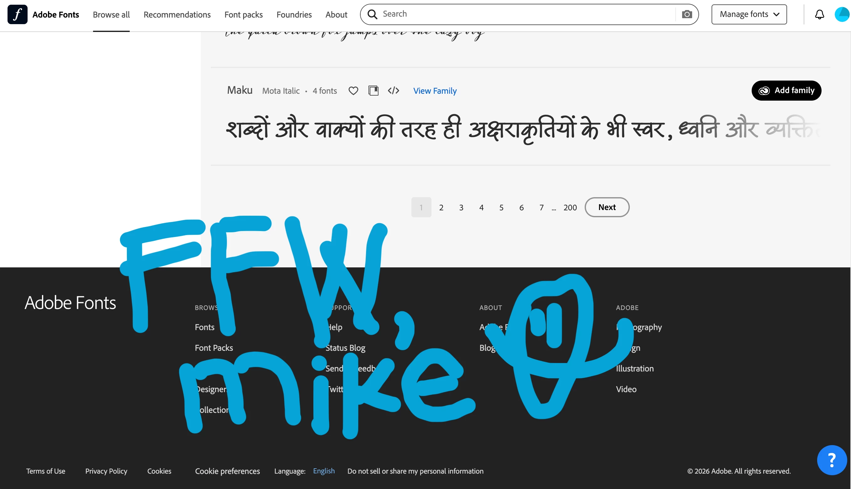 The 200 page limit on the Adobe Fonts web site is frustrating. I'd like to see more than just 12 type families listed per page. I usually work around the 200 page limit by browsing in more specific categories, such as browsing by specific type foundries.