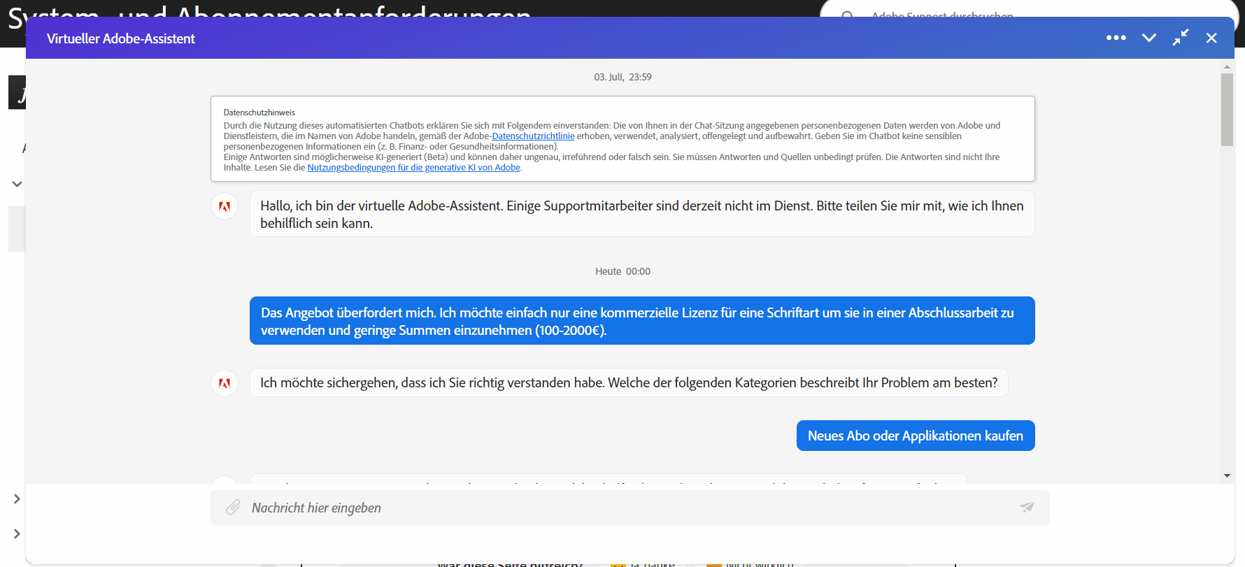 Kann dieser darüberhinaus nicht innerhalb von fünf Minuten ein Abo für Acrobat verkaufen so verlässt er wortlos den Chat.
