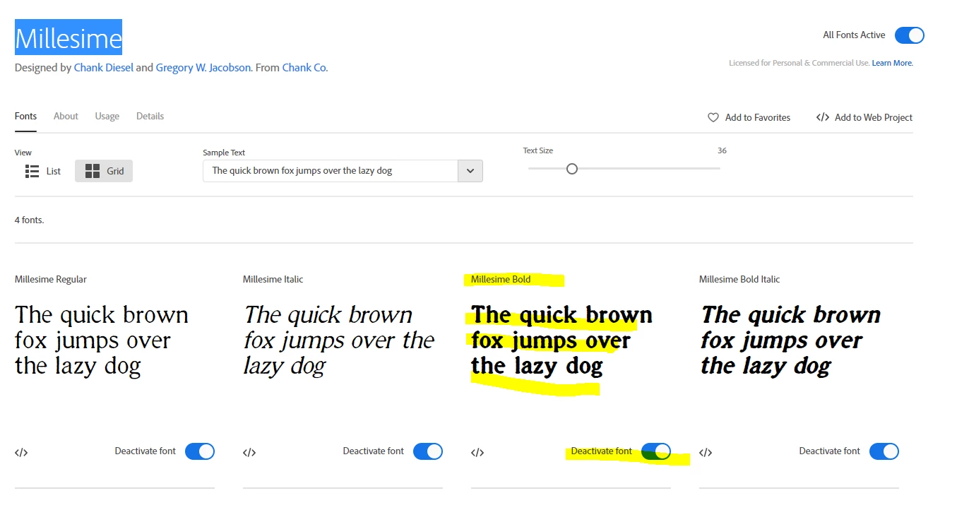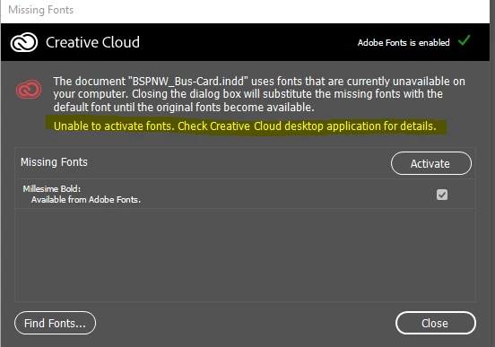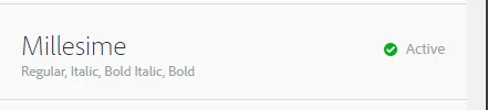 I had this font activated, but with one of the last few CC updates as well as updates to different apps, I can't reactivate Millesime Bold. I have no idea why that particular font fact won't activate. The rest of the font family will activate and does not show as missing when I open application where I' have used this font. I need it active in ALL of the apps as I'm using for a project with several applications.