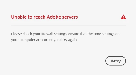 "Unable to reach Adobe servers"