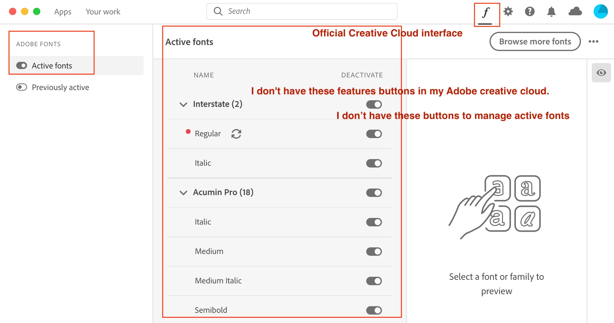 In addition, The most important thing is that my Creative Cloud doesn't have any button to manage and synchronize fonts, and I can't find my active fonts in the MAC font book.(my Creative Cloud also doesn't have any buttons for fonts in its preferences)