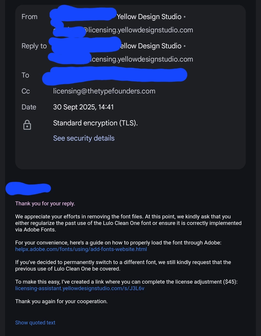 Designstudio asking for 'licensing fee payment' post-adobe font subscription