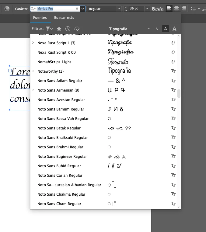 Una gran parte de la tipografías me muestra la previa con caracteres raros.