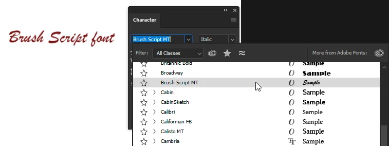 I have been using Brush Script MT for years. Even before installing CC. After installing CC 2 years ago, I've used Brush Script MT a lot in Photoshop. It's the font we use for our club's name.