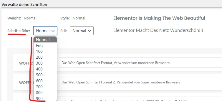 Wenn man sich Poppins herunterlädt, hat man 18 .ttf Dateien. Diese müssen nun mit der Elementor Funktion auf dem Server hochgeladen werden. In Elementor kann man auch die Schriftstärke zur jeweiligen Font auswählen.