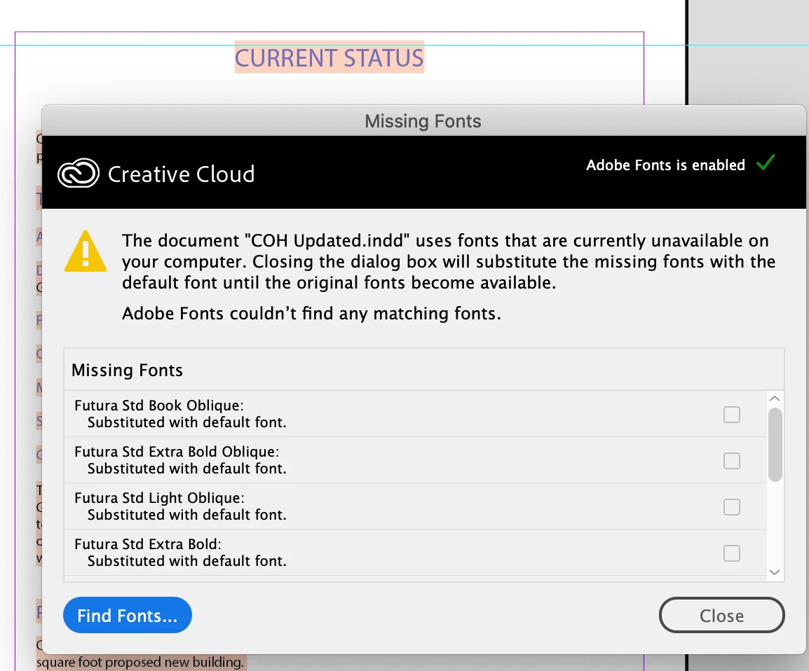 If you had such a font family previously, you licensed it is some manner other than via Adobe Fonts. There is a Futura Std family available via the Adobe Font Folio 11 product, but for a number of years, Adobe no longer licenses that font separately. And Adobe never bundled that font with any applications. I suspect that either (1) you previously licensed that font and successfully used it with your documents or (2) edited documents using those fonts from an InDesign package where those fonts were physically located in a subdirectory named Document Fonts.