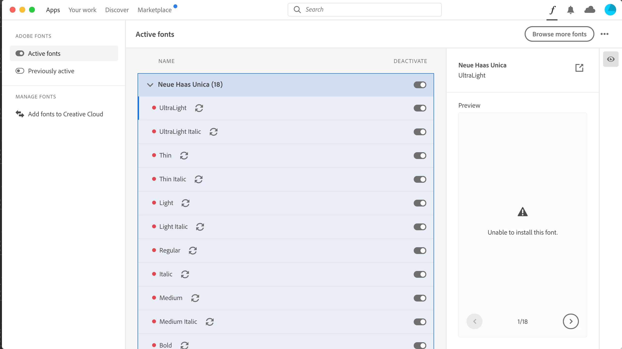 I'm trying to activate the Neue Haas Unica family font to use it in Illustrator and it allways popps up the same error. I've tried to resolve this and it's simply not working.