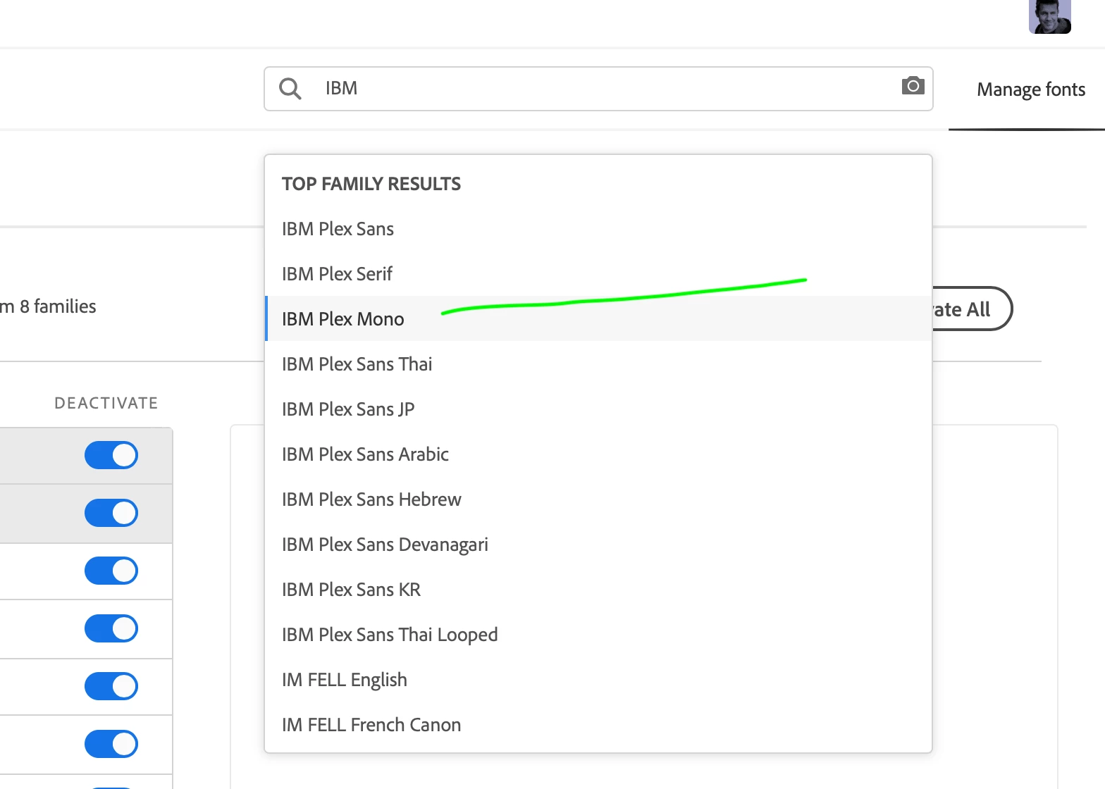 marcusFCMKnown ParticipantForum|Forum|3 years agoApril 26, 2022QuestionHelp please (Font activation)Forum|Forum|3 years agoApril 26, 20221 reply328 viewsI'm trying to find and download/activte the font IBMPlex monoI have found it under 'manage fonts'...'browse more fonts' then out to the web. ...search all fonts and founderies etc and it's there but nothing happens when I select...Please can anyone help?Thanks MarcusDownload
