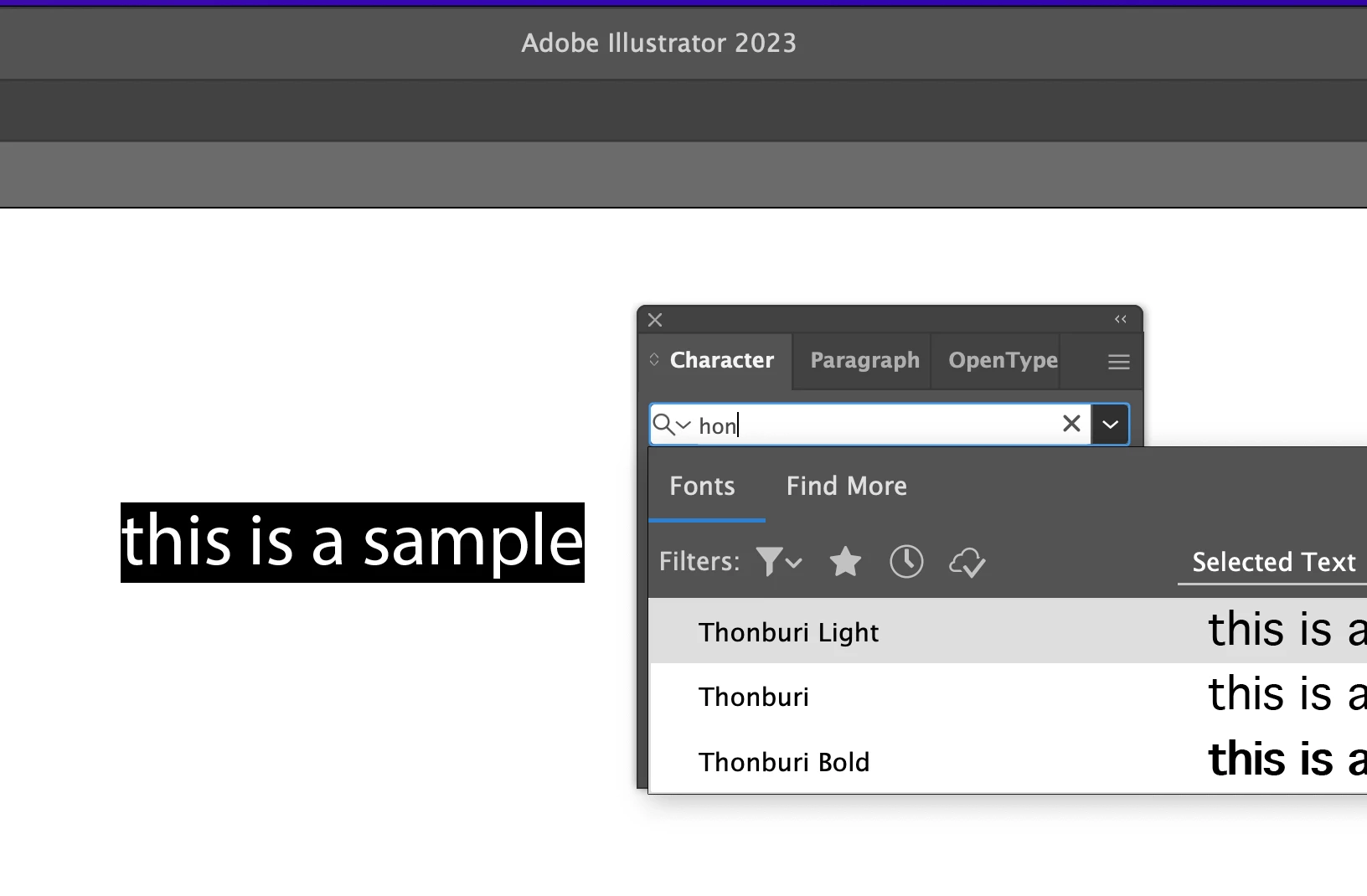 I tried to install a font called Hondafont in Creative Cloud desktop on my Mac for use in Illustrator, but it will not show up in the drop down font list in the Illustrator character window.