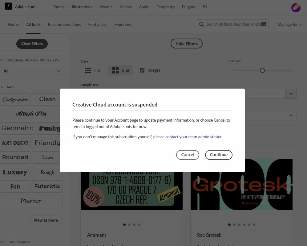 My company have renewed the adobe cloud's subscription and card info but I everytime I go the adobe font page, a message pops up stating that my account have been suspended but everything I use with adobe cloud works perfectly fine and have doubled checked my account and I seem to have access to everything else EXCEPT for adobe fonts.