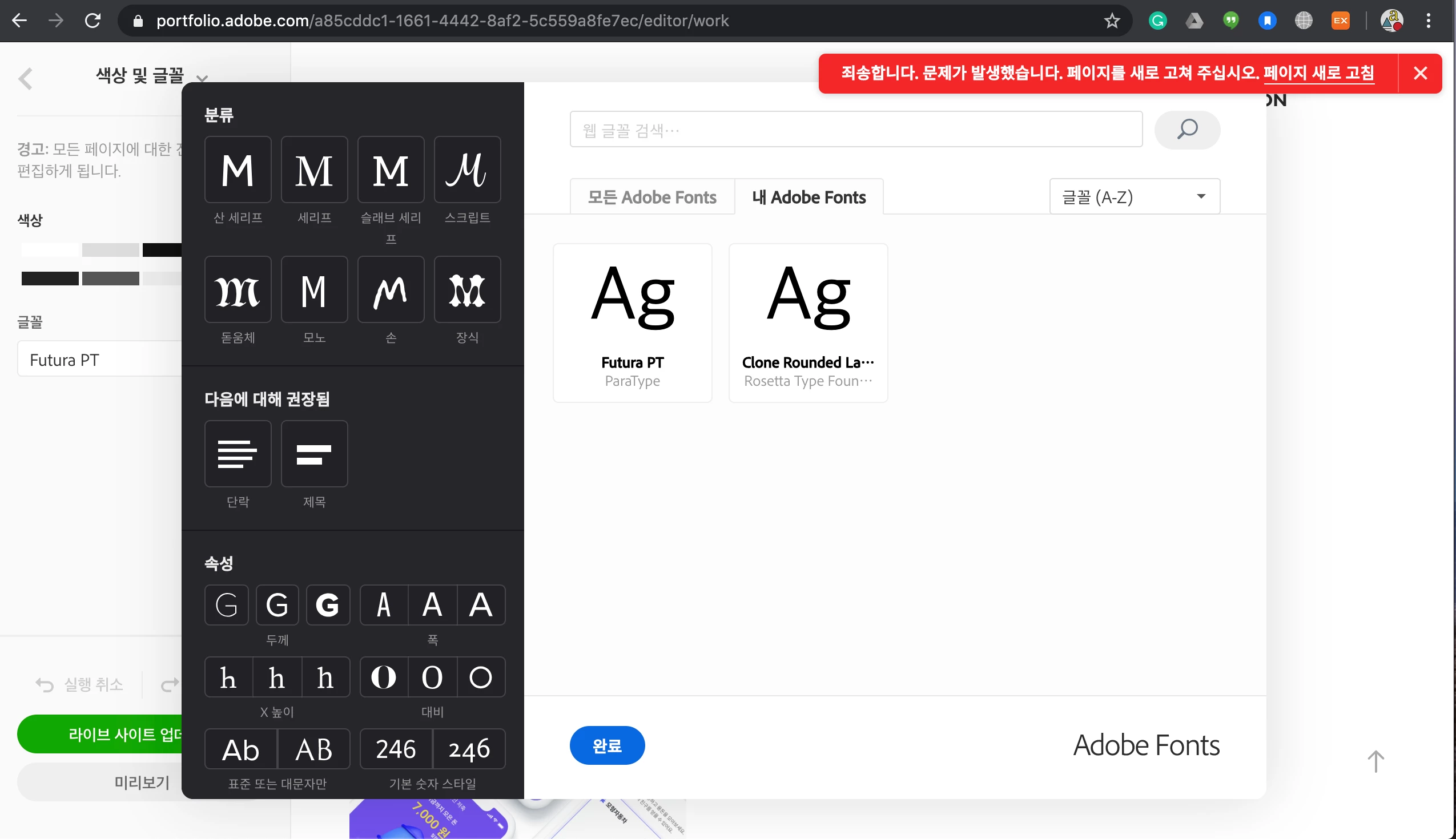 When I click on the font to apply Adobe Ponts to every page, that red warning message pops up and says, "Sorry. Problem occurred. Refresh the page."