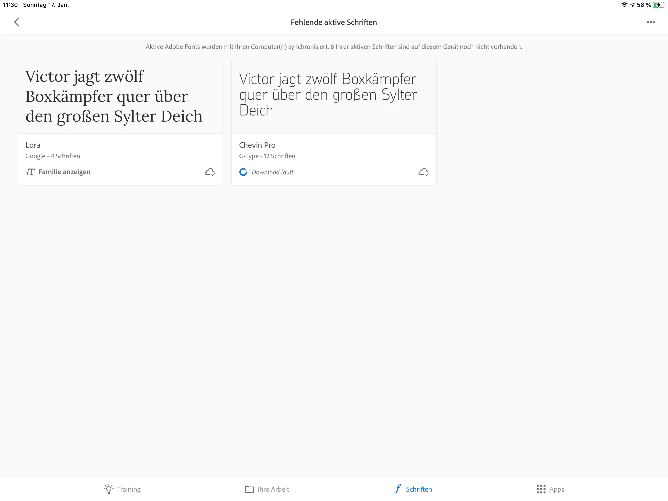 While adding the font (chevin pro) with the creative cloud app, the download never finishes: