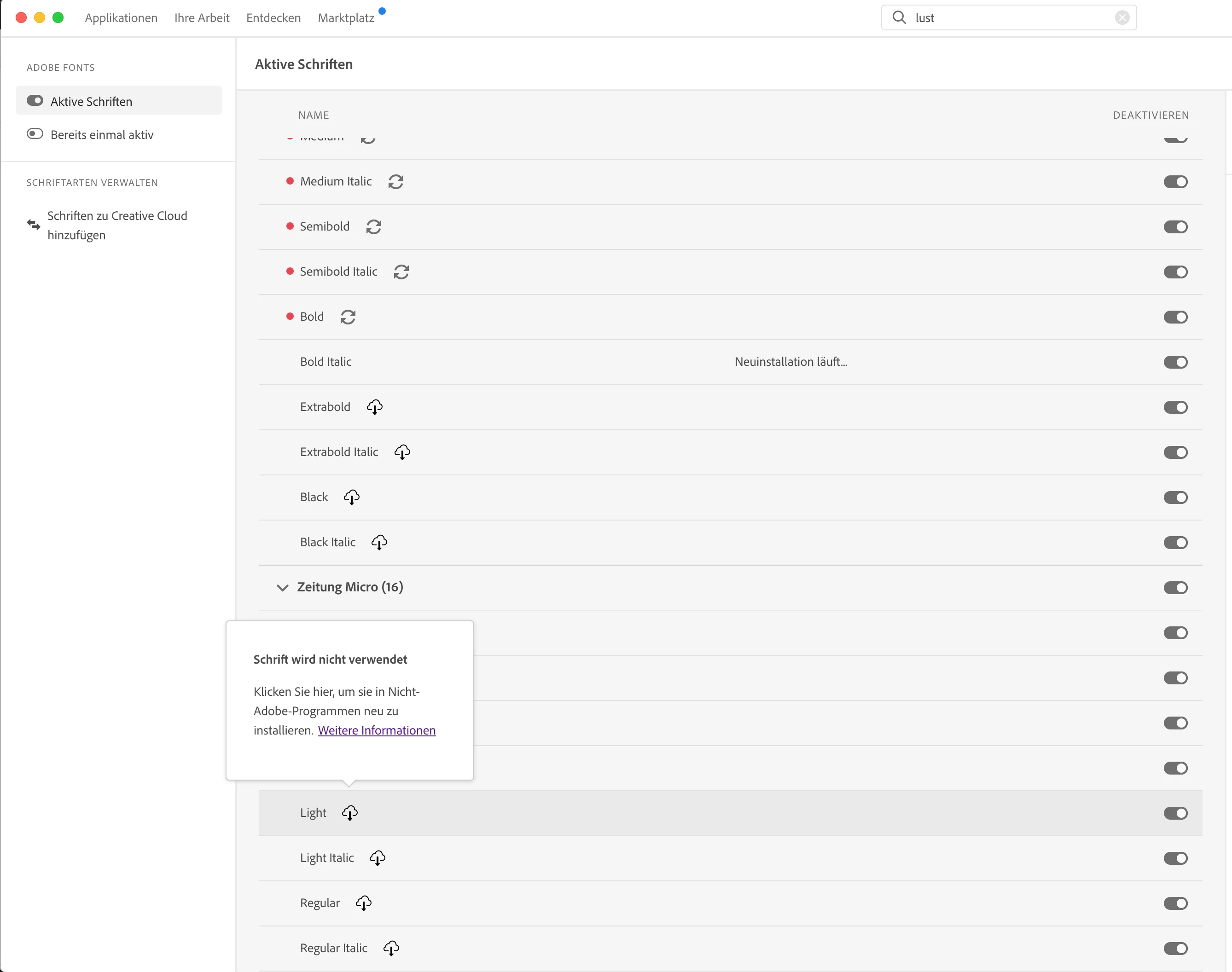Is there any faster way to reinstall automatically deinstalled fonts other than clicking on every font one by one? There has to be, right? Like, for example, a download icon right next to the font family at least? So I can reinstall the whole font family at once? Or maybe even up top next to "Active Fonts", right? So that I can reinstall all fonts with one click? Or do I really have to to click a few hundred times?