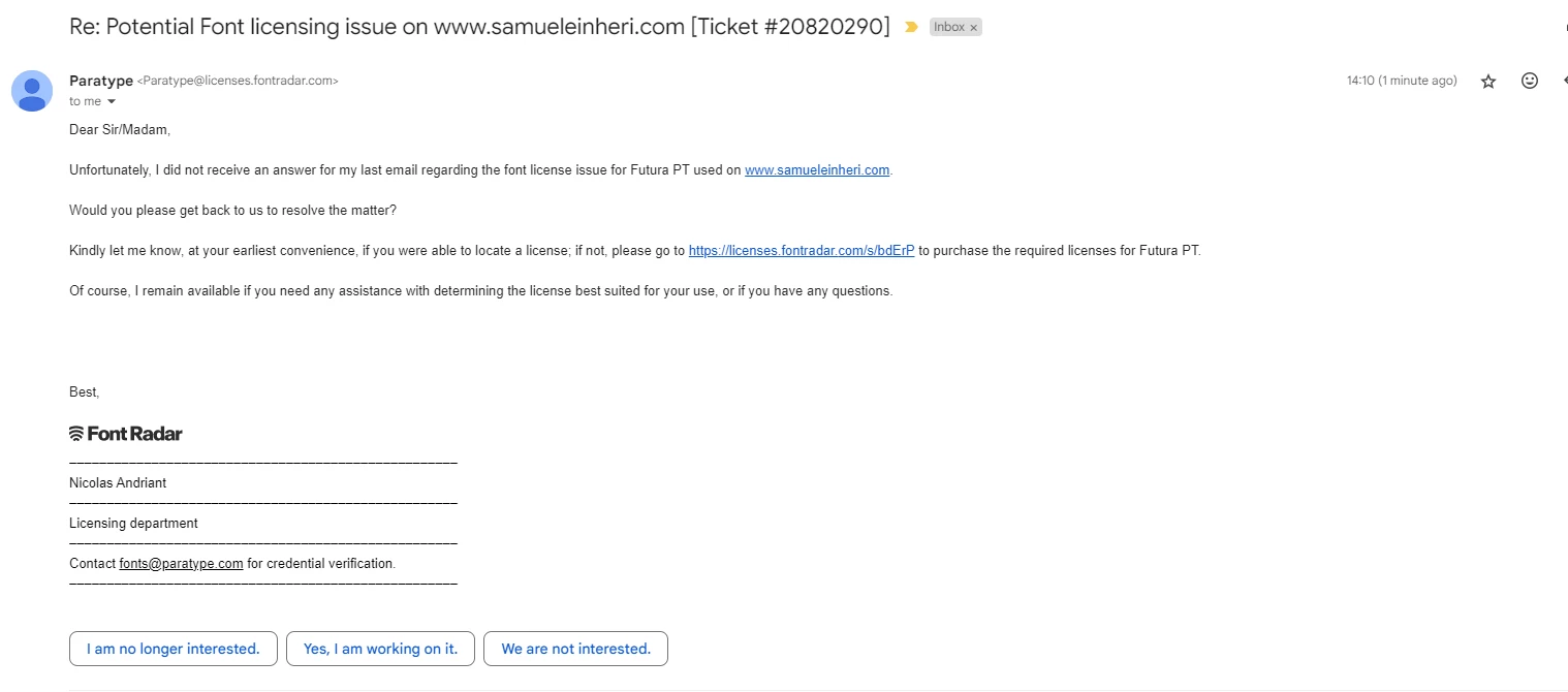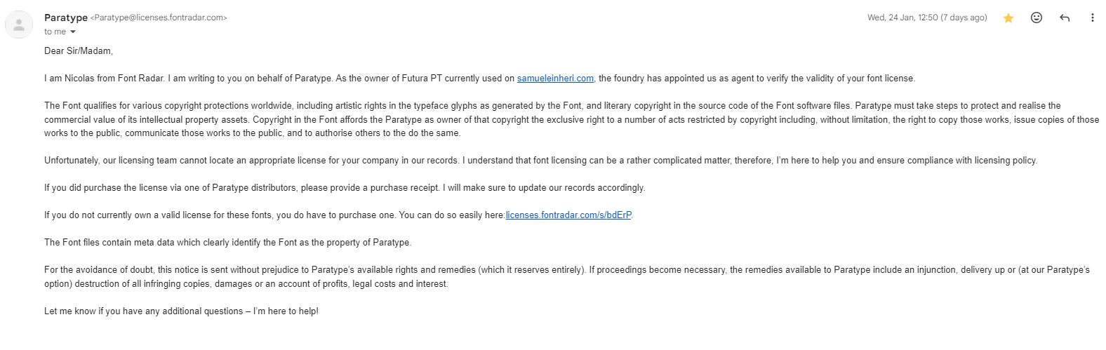 I have an issue where an individual claims that I need to pay for a license for the Futura PT font, a font that I downloaded & used for my Portfolio. Since I got the first email, I've removed the font from my portfolio & changed all text objects that used that font to something else that's built in to the platform that I use to host my website (which is Wix).