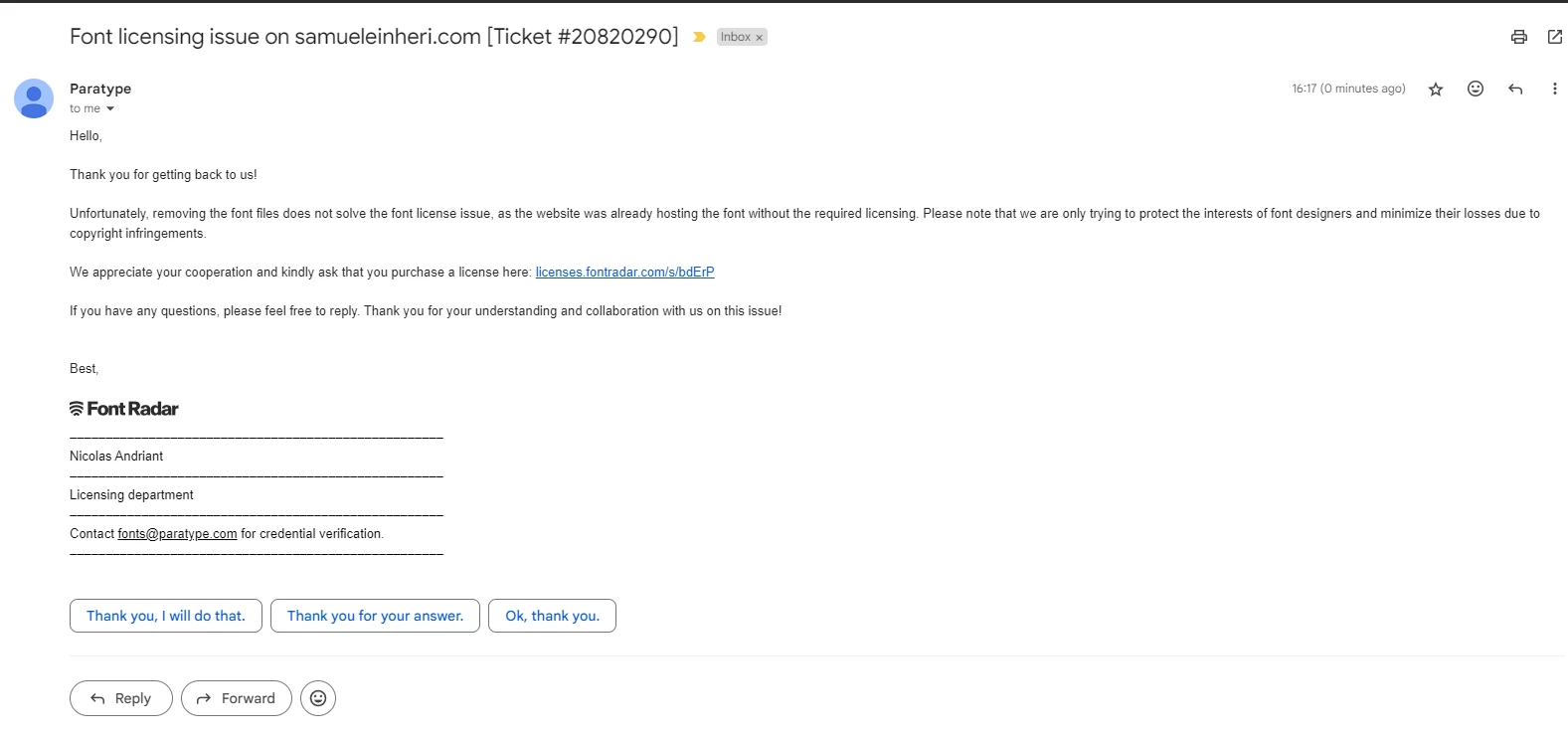 The only thing I've responded that I've removed the font from my Portfolio but the individual still claims that I still need to pay for the liscense despite me removing it from my Portfolio.