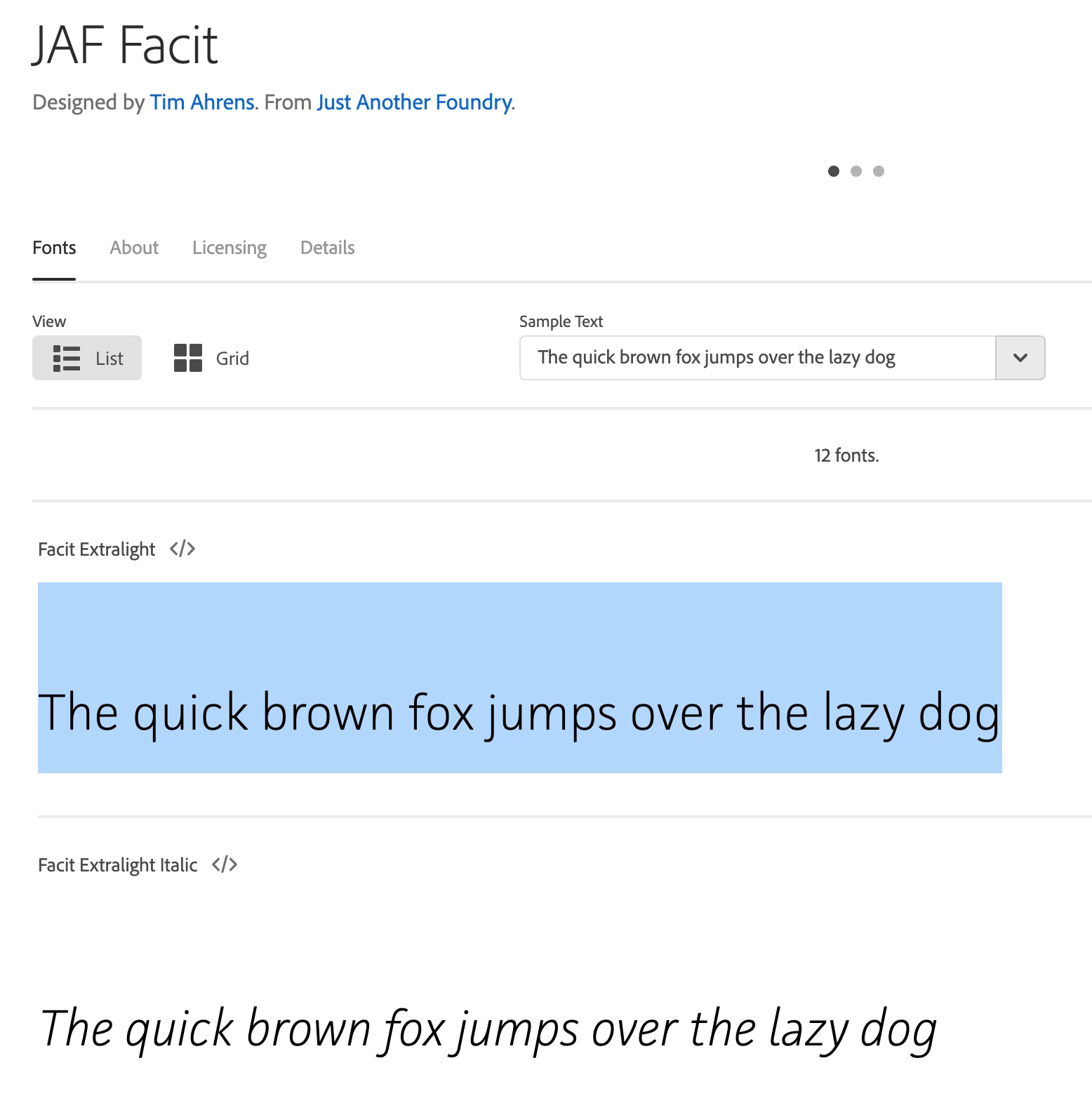 We have noticed that JAF Facit has excessive spacing above the text itself in the line height. When I looked at Just Another Foundry's own website, the typeface isn't displayed in this way but on our clients sites and on the Adobe Fonts website it is here: