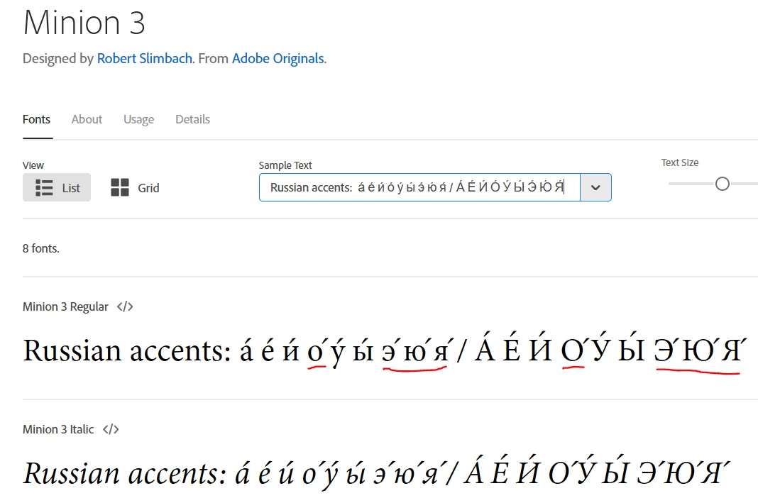 Is this an artefact of the online test tool, or could it be a bug in the actual typeface? If so, will it be fixed in the (near) future? Without proper accents, Minion 3 cannot be used for didactical or linguistic publications on Russian. That would be a pity, since it seems to be one of the rather few typefaces that combines professional quality with a large range of characters useful for linguistics.