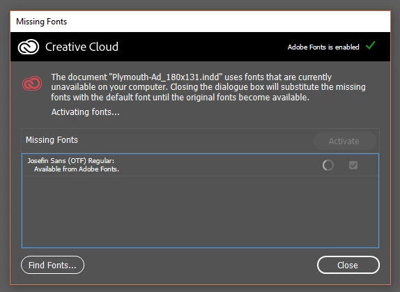We are sorry to hear you are experiencing missing fonts issue. We would request you to please try the steps suggested in this article: https://helpx.adobe.com/fonts/kb/resolve-missing-fonts.html