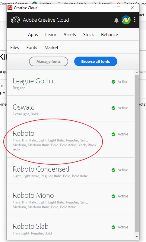 I am having an issue with some Type Kit font styles not showing up in InDesign, Illustrator, or After Effects. They styles are listed on my Creative Cloud app, so I know they were synced from Type Kit. Specifically, I am having issues with the Roboto font style Black. Black Italic shows, up in the programs, but not black. Here is a screen shot of my Creative Cloud app.