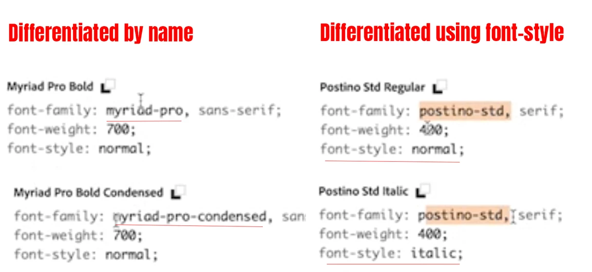 Adobe Caslon Pro Semibold, Adobe Caslon Pro Semibold Italic, and Adobe Caslon Pro Bold Italic. Previously, I was able to select a specific font type under the same family, add it to my project and then copy the font family name which was different for each font, and I referenced this in Shopify or in Shogun. It worked. This meant I would have the font name as - ddobe-caslon-pro-semibold-italic.