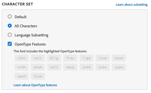 Is there a way to select exactly which OpenType features you want to enable in a webfont added to a web project in Adobe Fonts?