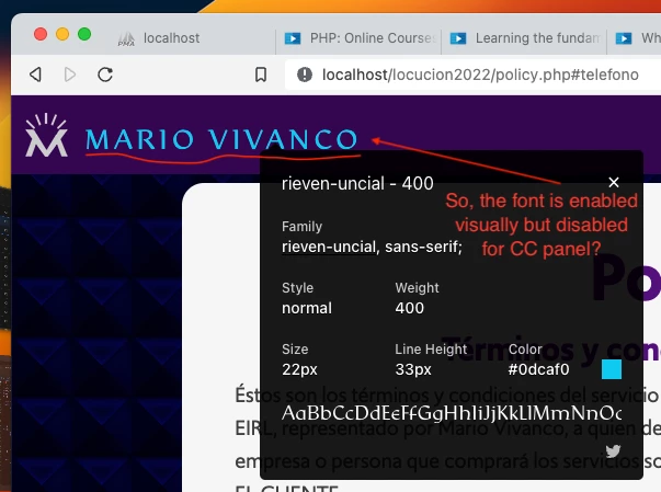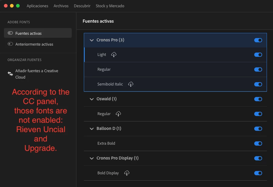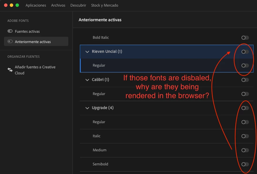 I have a project in Dreamweaver with some adobe fonts, 2 of them: «Upgrade» and «Rieven-Uncial». I will refere about this last one which is more obvious to be noticed. I attach the screen of the browser and is rendering Ok. However in the Creative Cloud panel and in the Adobe Fonts plataform, these fonts are shown like disabled. Check pictures, please. It is not suppposed to be like that. Or is a a kind of benefit that the font is hosted in a cachè or in my local computer, so the font is shown as it is enabled. With the «Upgrade» font happenes the same. Should I asjust something? I cleared the history with ⌘ + Y, but same. Could you help me to clarify this, please? Thank U 4 your patience.