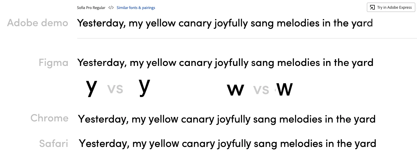 We need to use a Sofia Pro font in a client's project and we have noticed that at least the letters "y" and "w" look completely different when the font is used in the website. The demo on Adobe Fonts site looks OK, also the Font file we are using in Figma. Please see the attachment.