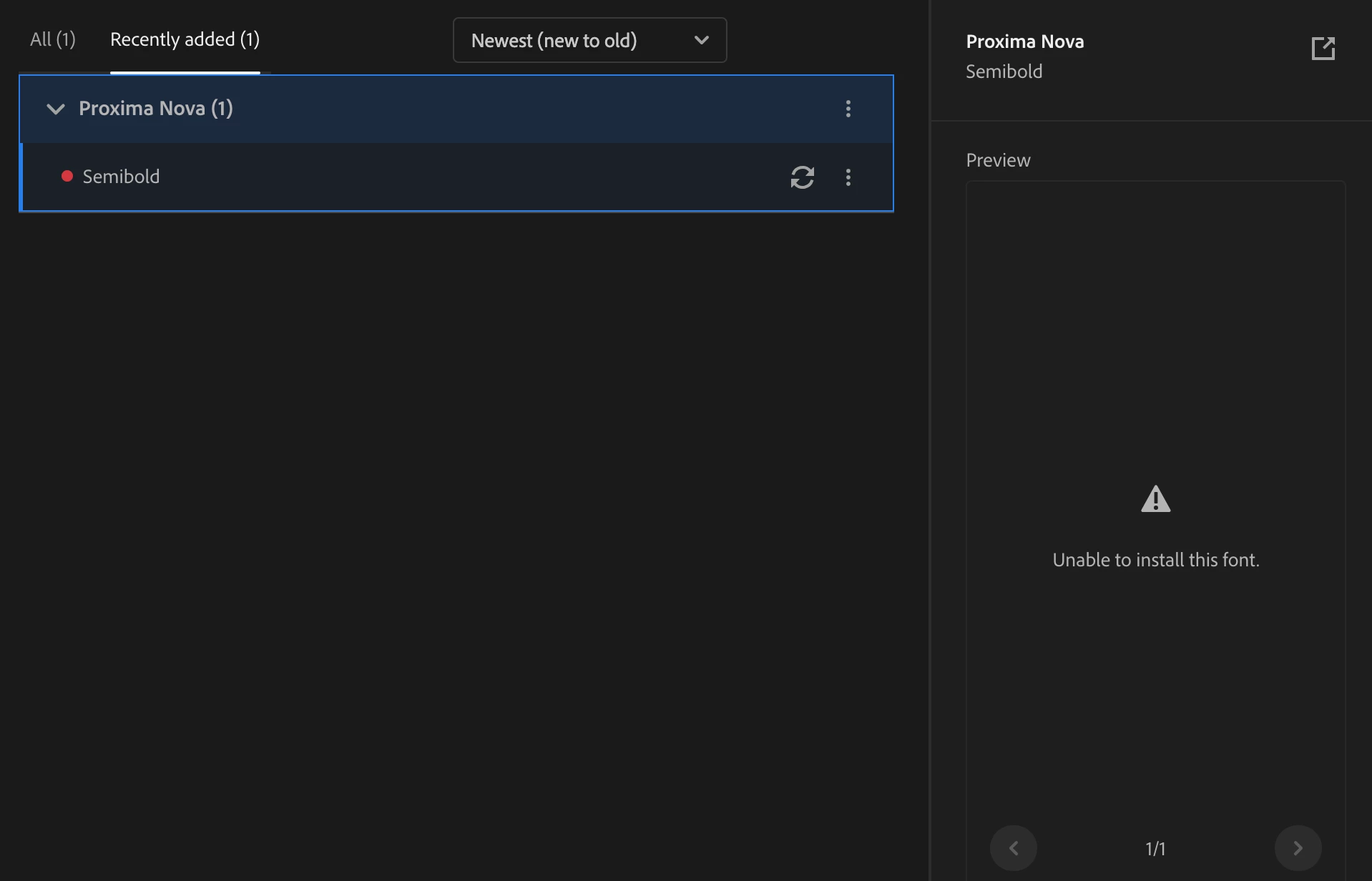 I have a specific font that I use every day for my job. Proxima Nova. Today I was unable to use the font and went to make sure it was properly installed. Upon hitting the refresh button multiple times I just get a message saying "Unable to install this font"