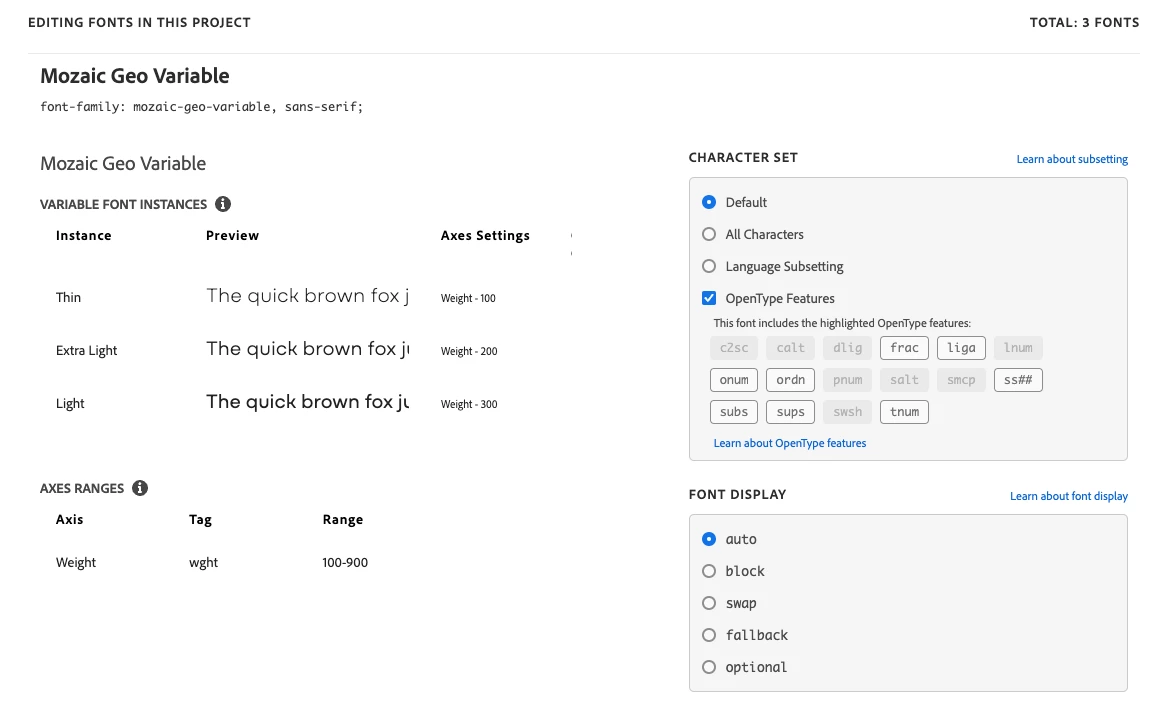 Hello! Using a variable font for the first time on a web project. The font is loading ok on the site, but the "font-weight" property doesn't seem to be working for all the font instances shown in the adobe fonts control panel. I did get this property to work... "font-variation-settings: "wght" 150;", so I'm not completely in the dark, but seems like the normal font-weight property should work as well. Maybe I'm missing something in the settings? The font I'm using is Mozaic Geo Variable. Thanks for any information!