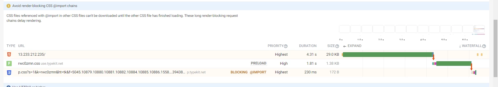 You cannot download CSS files that are referenced with @1552174 in other CSS files until the other CSS file has completely loaded. Rendering is delayed by these protracted render-blocking request chains.