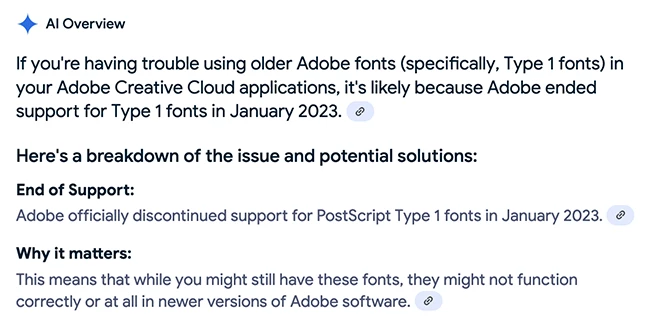 I should preface this by saying I have my own collection of Adobe fonts that I have been using for around 20 years, and I had TONS of them. They always loaded and worked with NO problems. I've also been using the Typeface app for font management and never had any problems. Yesterday, I finally got to working on a job and have just found out that the new 2025 Adobe programs will not let me use my old fonts anymore. This is a NIGHTMARE! What's worse is that alot of fonts I was using are not to be found when I use the "browse font" button on CC. For example, my collection of fonts had over 50 styles of Helvetica Neue, and when I search for them on Adobe CC I'm only finding 14. This SUCKS, to put it mildly. I found this on Google: