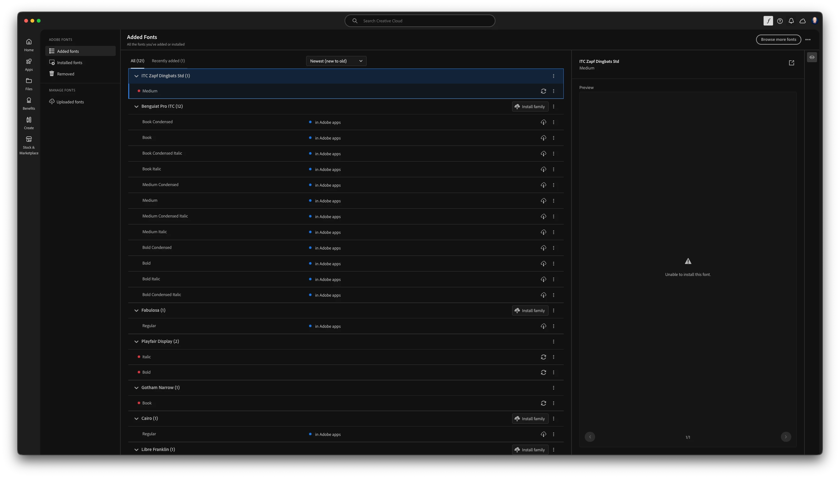 The Creative Cloud app is also missing essential functionality. The Adobe Fonts section should support real search and filtering by style, mood, and classification directly inside the app, without forcing users back to the website. Right now it feels incomplete.
