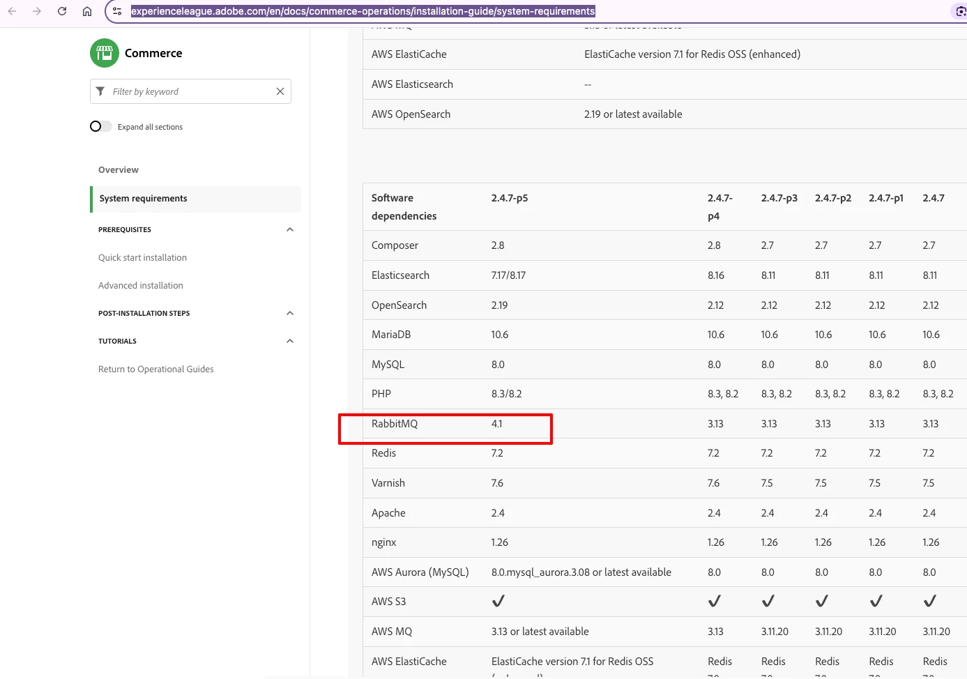 While reviewing the system requirements for Adobe Commerce 2.4.7-p5 on the DevDocs, I noticed that RabbitMQ 4.1 is listed as the supported version. However, I couldn’t find any reference to RabbitMQ 4.1 in the 2.4.7-p5 release notes.