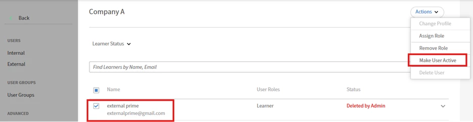 If an external learner is deleted by admin as the user is no longer part of that external profile or organization and now in case the user is rehired and belongs to a different organization or partner, admin can follow the steps below to reactivate the user profile: