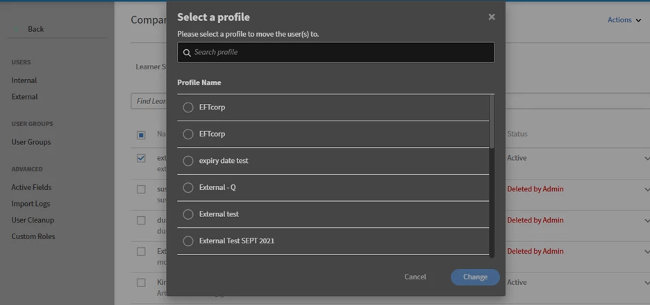 - You will see all external profiles. Select the external profile to which you want to move the learner to: