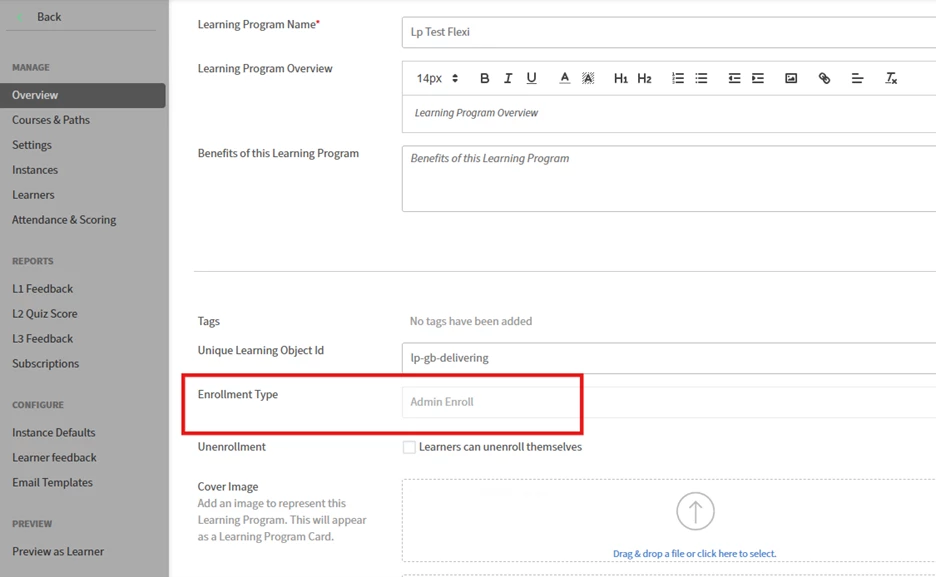 - If the learning path is already added and still the learners are unable to see it, then open the learning path and check below Enrollment type field: