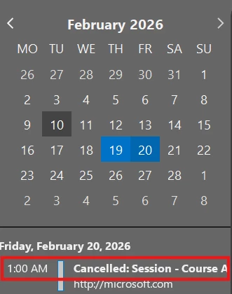 - Once learners are unenrolled and the appropriate templates are enabled, the session cancellation email is triggered, and the session will be marked as cancelled in the learners’ calendar.