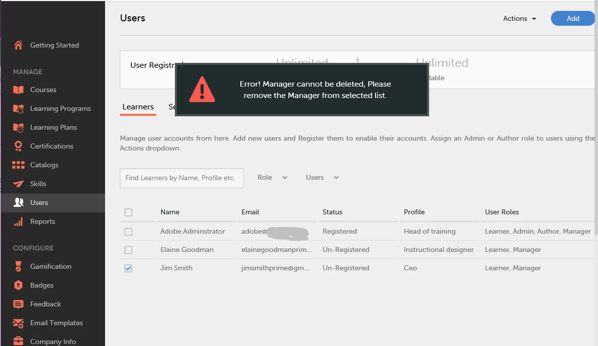 I managed to get the CSV upload feature working by tweaking the example csv file from the adobe. Now I think I've cracked it I'm trying to delete the test users so I can start afresh, but it's not letting me delete 'managers'. Please advise:
