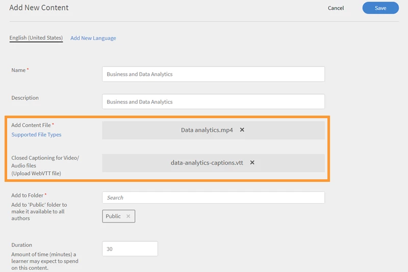 Caption support is available for video and audio content files uploaded in Content library in Captivate Prime.
