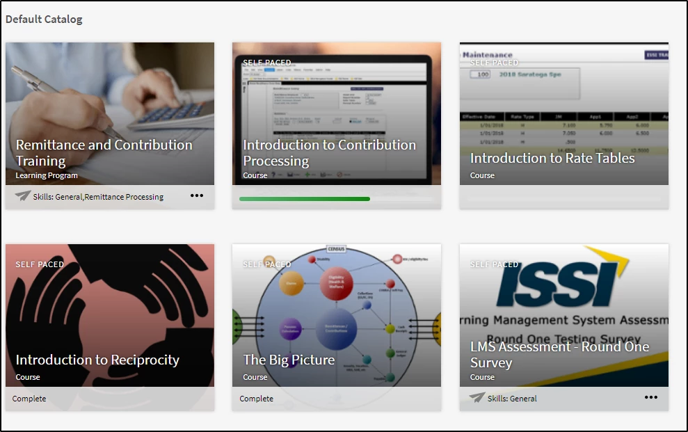In that top row, the "Remittance and Contribution Training" is the Learning Program, which is comprised of "Introduction to Contribution Processing," "Introduction to Rate Tables" and "LMS Assessment - Round One Survery".